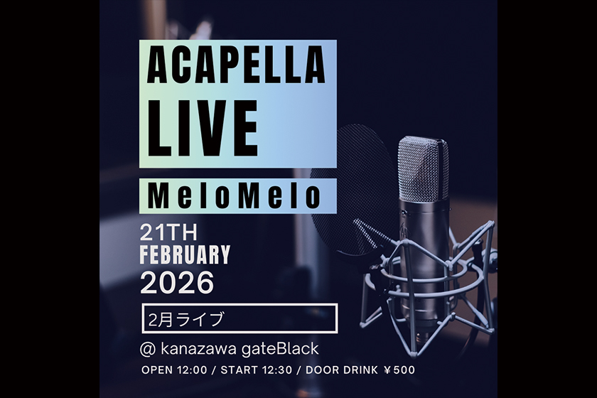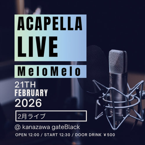 2月ライブ 2月 21 Sat 2026 LIVE 金沢大学アカペラサークル MeloMelo OPEN 12:00 / START 12:30 DOOR DRINK ¥500 INFO. gateBlack 076-234-3430 前のスケジュール 次のスケジュール