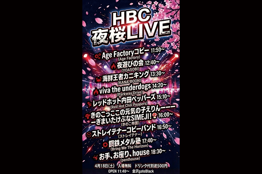 HBC 夜桜LIVE 4月 18 Sat 2026 LIVE HBC 北陸バンドサークル OPEN 11:40 / START 11:50 DOOR DRINK ¥500 INFO. gateBlack 076-234-3430 前のスケジュール 次のスケジュール